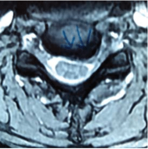 MRI showed severe prolapsed cervical disc indenting the spinal cord and neuroforamen’s of C5/6. There was evidence of spinal cord pressure with T2 changes seen on the sagittal views.